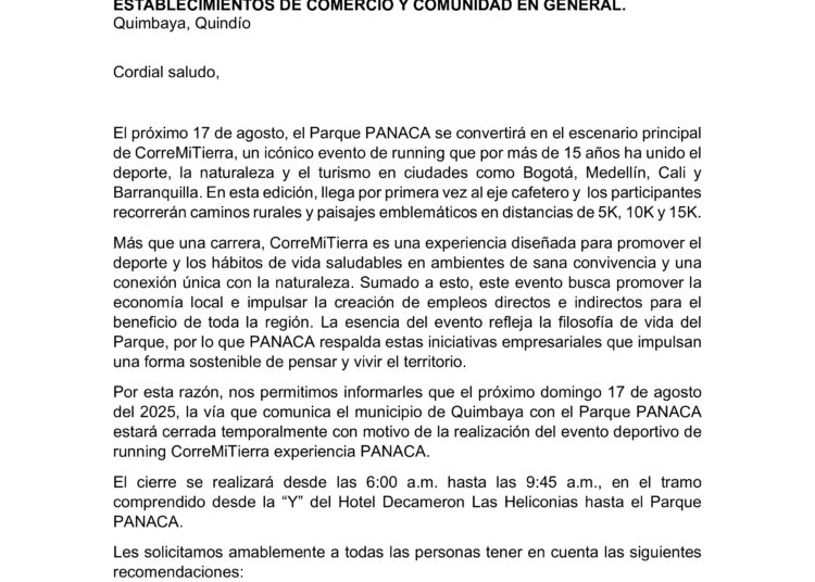 Mediante el presente comunicado de prensa el Parque PANACA se permite socializar el cierre vial que tendremos el próximo domingo 17 de agosto en la vía que comunica el municipio de Quimbaya con PANACA desde las 6:00 a.m hasta las 9:45 a.m con motivo de la realización del evento deportivo de running CorreMiTierra experiencia PANACA. El parque abrirá sus puertas con normalidad a las 10:00 a.m a todos nuestros visitantes