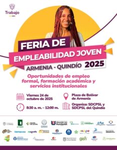 Con el propósito de fortalecer la inclusión laboral y la formación para el trabajo, el Gobierno del Quindío liderado por el arquitecto Juan Miguel Galvis Bedoya, invita a todos los jóvenes del departamento a participar este viernes 24 de octubre en la Feria de Empleabilidad Joven 2025, que se realizará en la Plaza de Bolívar de Armenia, entre las 8:30 a. m. y las 12:00 m.