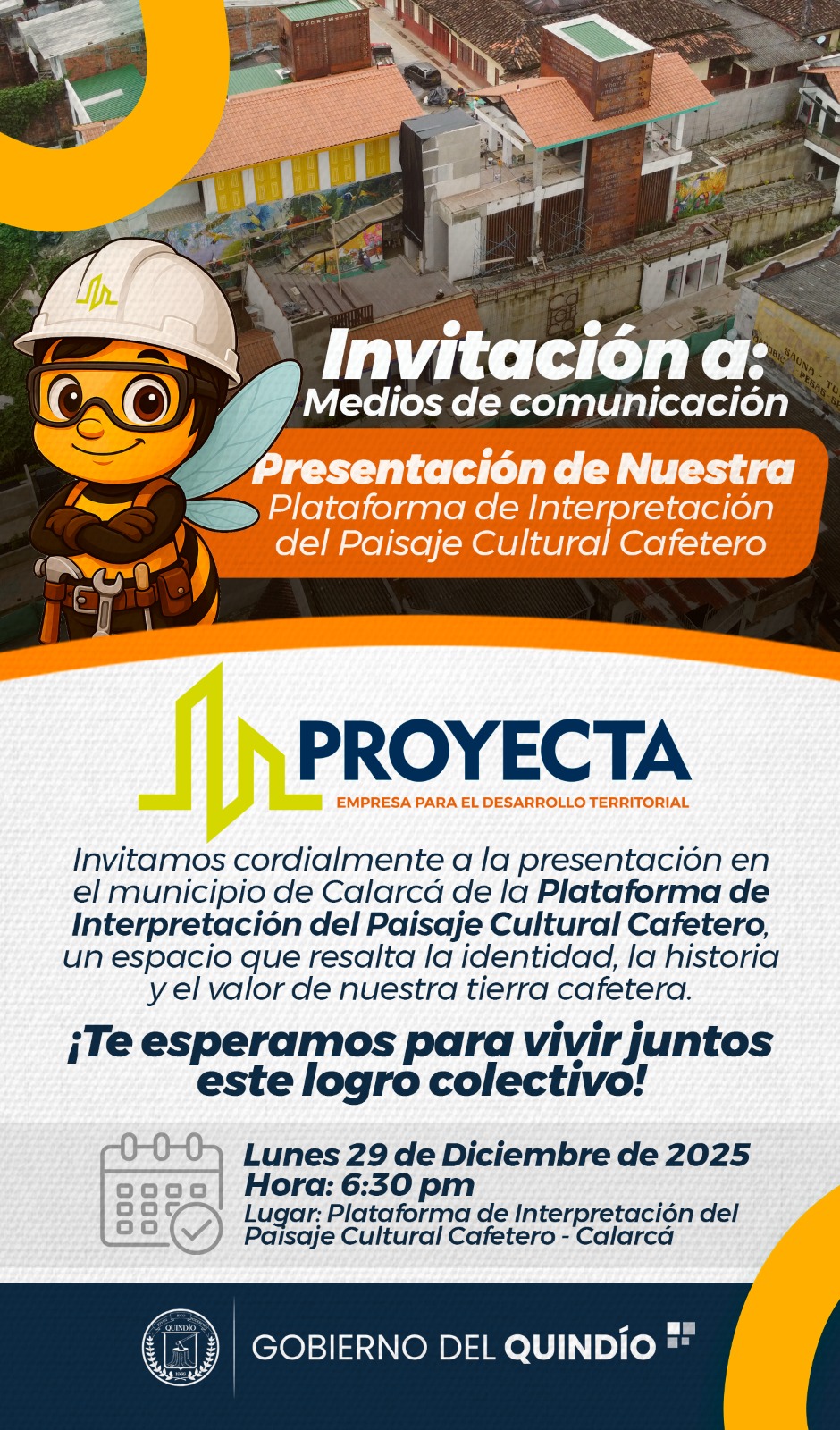 Juan Miguel Galvis Bedoya, gobernador del Quindío; y Lina Marcela Roldán Prieto, gerente de PROYECTA, invitan a los medios de comunicación a la presentación de la Plataforma de Interpretación del Paisaje Cultural Cafetero -PCC- «Ciudad sobre letras» en el municipio de Calarcá.