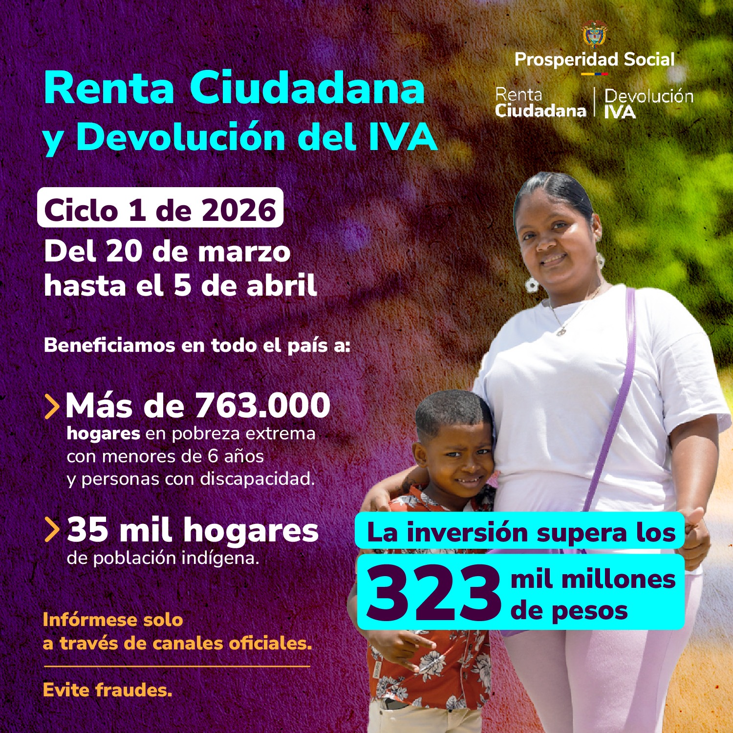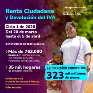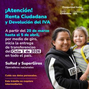 Bogotá D. C., 17 de marzo de 2026 Prosperidad Social realizará el primer ciclo de transferencias de los programas Renta Ciudadana y Devolución del IVA desde el próximo 20 de marzo hasta el 5 de abril en todo el país.